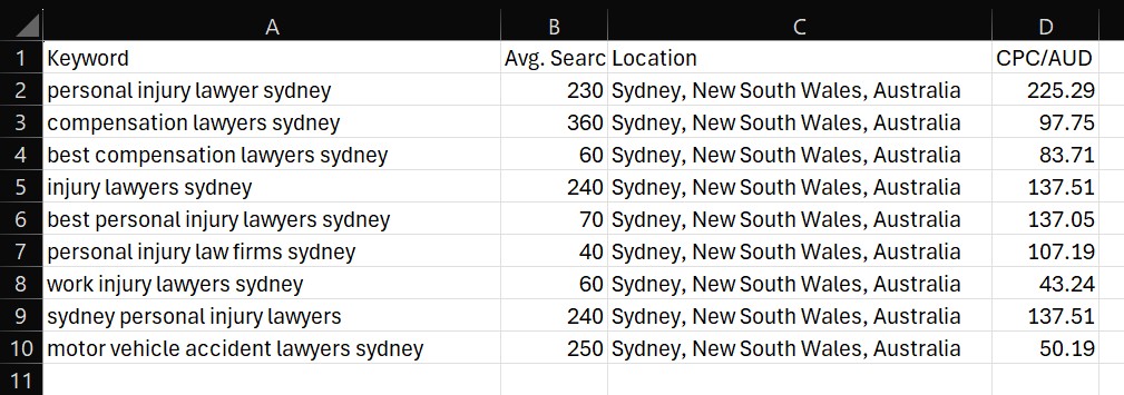 "Injury lawyers Sydney" costs $137 per click. "Compensation lawyers" runs $97.54. "Injury claim lawyer" hits $203.